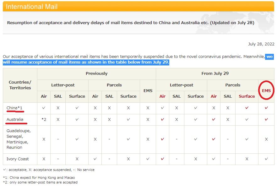 8/21/22 Resumption of acceptance of mail items destined to China and Australia etc. (Updated on July 28) Japan Post will resume acceptance of mail items as shown in the table below from July 29.