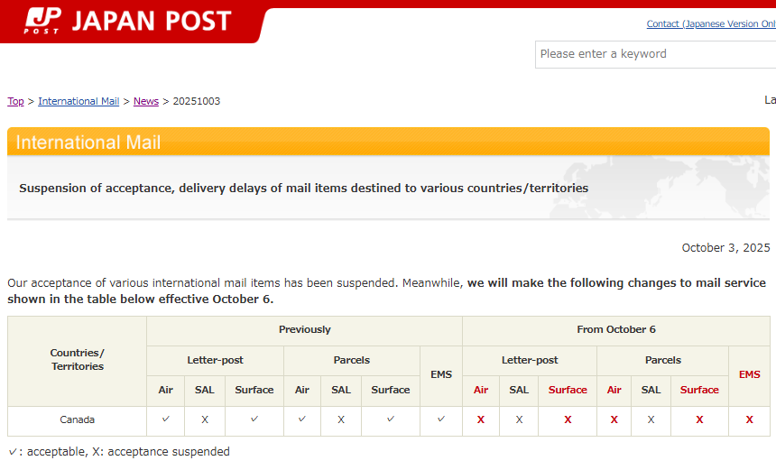 We would like to inform you that, effective October 6, 2025, Japan Post has temporarily suspended EMS (Express Mail Service) and surface mail services to